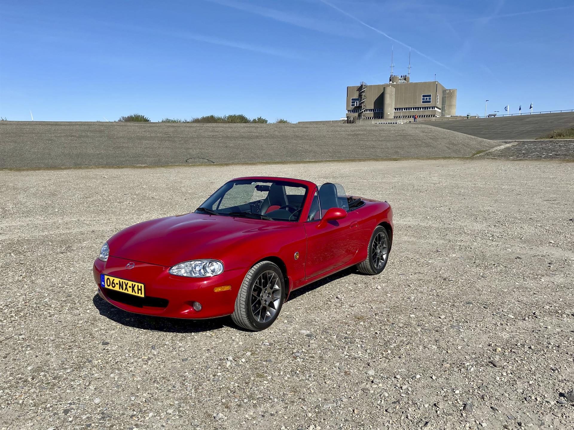 Strakke lijnen, beton, masten en dan die rode MX-5 die alles net even levendiger maakt. Het contrast werkt gewoon.